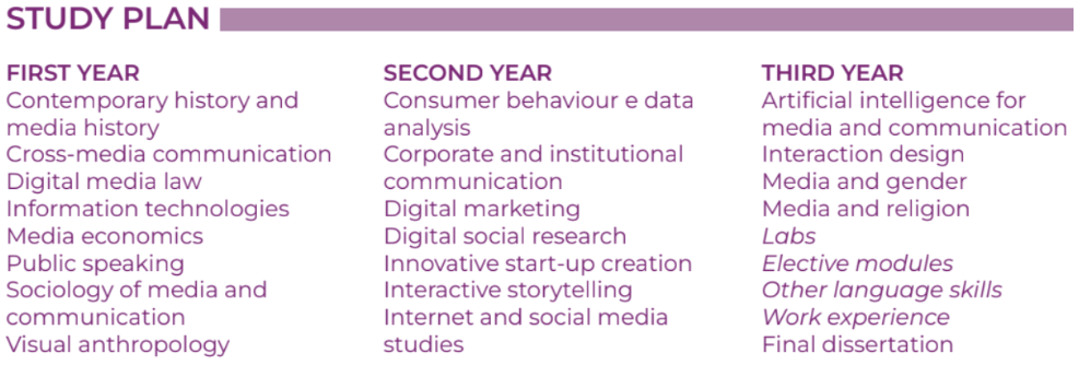 The Bachelor’s program in Communication sciences, media and digital technologies (L-20) focuses on analyzing cultural and communicative processes in digital media. It provides a comprehensive understanding of communication sciences, economics, social sciences, and the latest technologies.